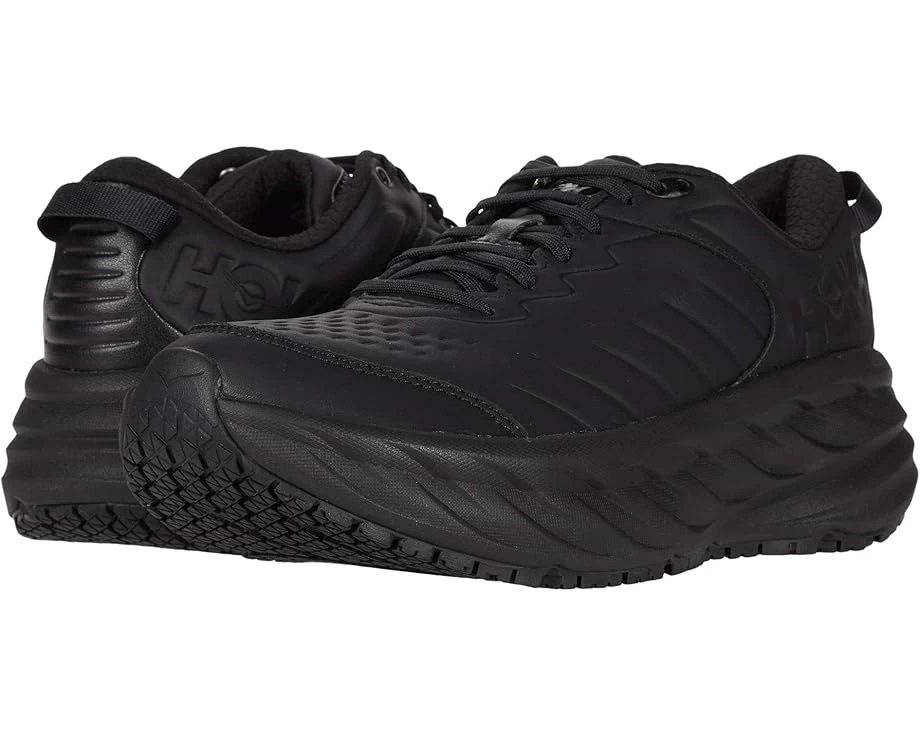 For information on how HOKA ONE ONE contributes to the community, please visit the About page.SKU: #9396365APMA Approved: The American Podiatric Medical Association Seal of Acceptance is awarded to products that promote good foot health and are substantiated by a committee of discerning podiatrists by wear-testing and review of the application and supporting documentation. APMA Acceptance must be applied for and is not automatically available to styles that meet its criteria.The Hoka One One® Bondi SR is an updated road shoe revamped to handle the demands of daily life. The Bondi SR features a water-resistant upper and slip-resistant sole that can stand up to the service industry and medical field alike, making it a true Workplace Warrior.Predecessor: None.Surface: Road / Various; tested on surfaces with water, oil, and soap for slip-resistance.Heel-Toe Drop: 6mm.Stability: Neutral; allows the foot to adopt its natural placement.Cushioning: Plush, all-day cushioning.Water-resistant full-grain leather upper.Padded memory foam collar with a heel pull loop for easy on and off.Flat laces allow traditional lace-up closure.Full-length EVA midsole delivers signature HOKA cushioning for all-day comfort and support.Early-stage Meta-Rocker geometry creates a unique fulcrum effect that encourages a smoother transition from heel-strike through toe-off. Ultra-grippy non-marking, slip-resistant rubber and tread design for optimal traction on a variety of surfaces.Imported.Product measurements were taken using size 8.5, width D – Medium. Please note that measurements may vary by size.Measurements:
