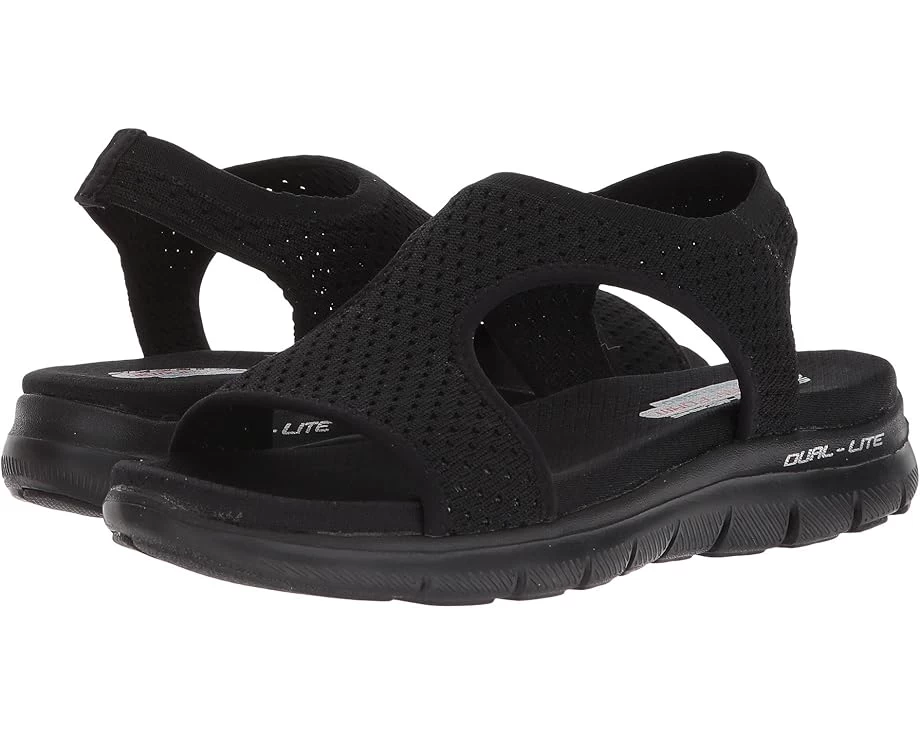 The SKECHERS® Flex Appeal 2.0 – Déjà Vu sandal offers a sporty silhouette with a Skech-Knit™ mesh fabric upper, open toe, T-strap design, and side cutout accents.SKU: #9041102Slip-on styling with continuous ankle strap for nearly seamless comfort.Breathable fabric strap lining.Gel-Infused Memory Foam™ cushioned footbed provides all-day comfort.Flex Appeal 2.0 design midsole with Dual-Lite sporty shock absorbing material.Flexible outsole with athletic style traction design.Imported.Product measurements were taken using size 8, width B – Medium. Please note that measurements may vary by size.Measurements: