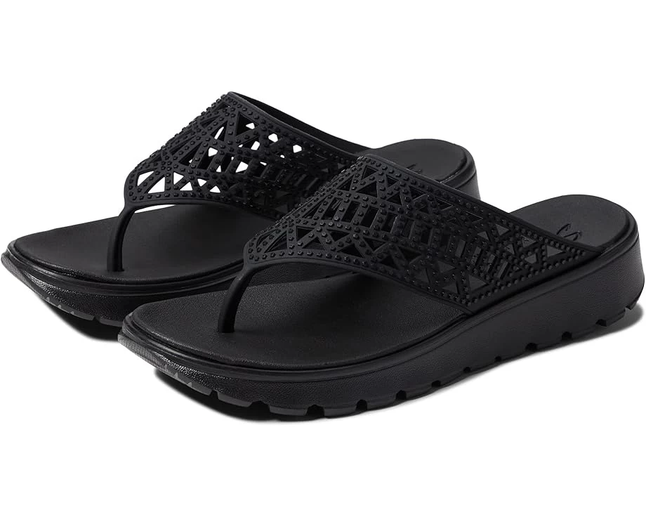 Add a chic touch to your summer fits wearing the comfy and casual SKECHERS® Foamies Footsteps Geometric/Rhinestone Hooded Sandal.SKU: #9629708Flip-flop sandals showcasing synthetic upper with geometric cutouts and rhinestone detailing.Synthetic lining.Toe post silhouette.Easy slip-on style.Durable synthetic outsole.Imported.Product measurements were taken using size 9, width B – Medium. Please note that measurements may vary by size.Measurements: