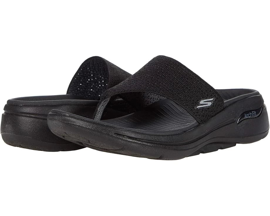 The SKECHERS® Go Walk Arch Fit Sandal is comfortable technology to slip on and go. Knit fabric upper is textured for extra style. SKU: #9487720Round, open toe sandal with durable center thong post.Arch Fit® contoured footbed.Arch Fit® insole with podiatrist-certified arch support.Lightweight and responsive ULTRA GO® high-rebound cushioning.Flexible rubber sole provides durability and stability.Soft man-made lining.Signature logo accents at side heel.Imported.Product measurements were taken using size 9, width B – Medium. Please note that measurements may vary by size.Measurements: