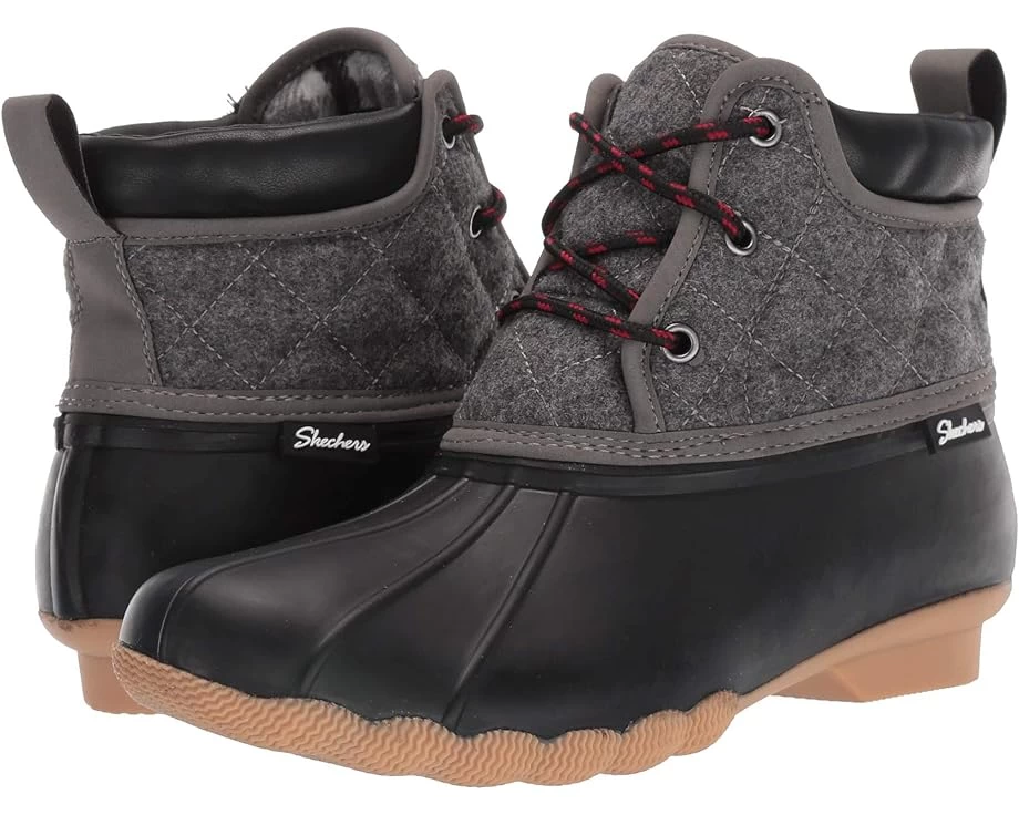 With comfort features, a mixed texture finish, and a duck boot silhouette, the SKECHERS® Mid Quilted Lace-Up Boot is a must-have style for the cold-weather season.SKU: #9270793Water-resistant wool and synthetic upper features a Scotchgard® treated finish.Waterproof, seam-sealed rubber shell at the upper.Lace-up design offers a secure fit.Round toe boasts raised, sculpted detailing.Padded tongue and collar.Quilted fabric insulated shaft for added warmth.Signature logo accent at the side.Breathable fabric lining.Memory Foam™ cushioned insole for all-day comfort.Contrasting, high-traction rubber outsole. Imported.Product measurements were taken using size 9, width B – Medium. Please note that measurements may vary by size.Measurements: