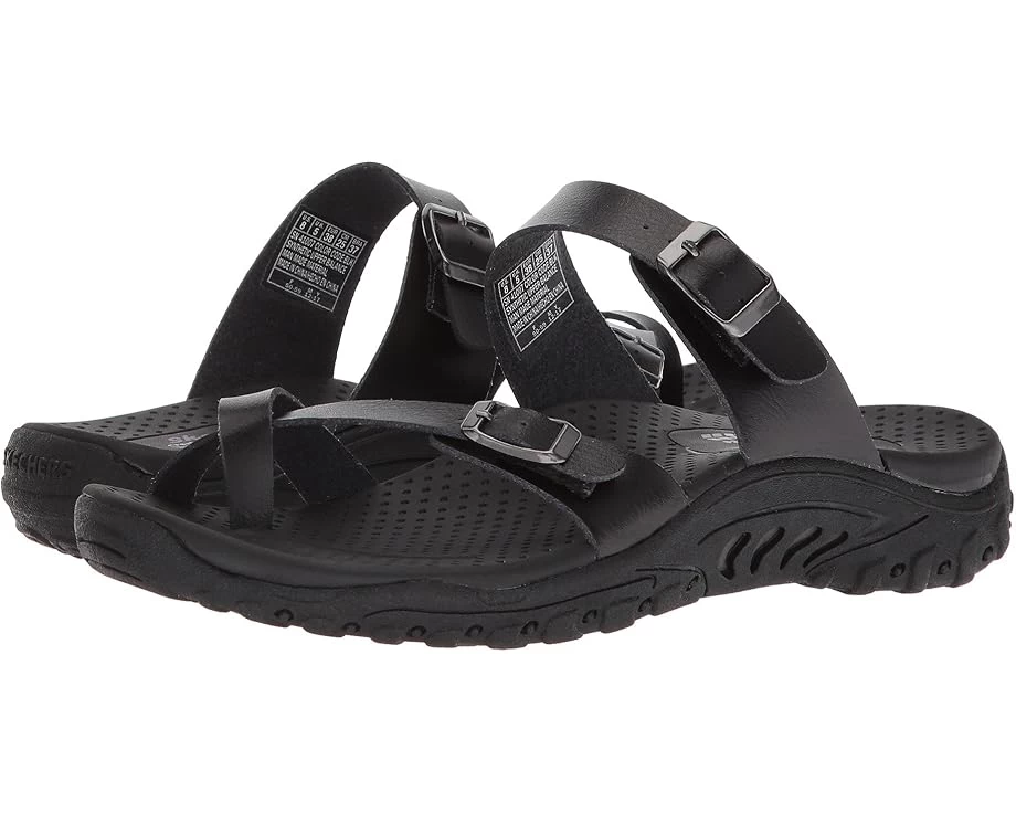 The SKECHERS® Reggae – Caribbean sandal offers stylish comfort with a smooth leather-textured synthetic upper and strappy toe loop design.SKU: #9033965Slip-on styling with adjustable metal buckles at the toe and instep straps.Instep strap boasts hidden elastic panel for comfort.Soft fabric strap lining.Cushioned and contoured comfort footbed.Supportive shock-absorbing midsole.Flexible rubber traction outsole. Imported.Product measurements were taken using size 9, width B – Medium. Please note that measurements may vary by size.Measurements: