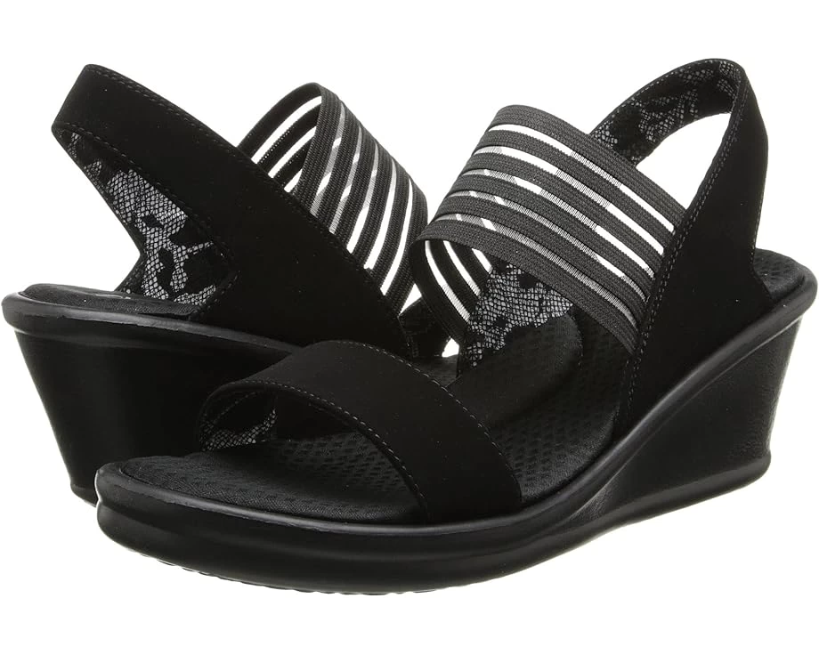 The SKECHERS® Rumblers-Sci-Fi wedge sandal combines comfort and style with a slingback ankle strap, striped mesh instep strap, and wedge heel.SKU: #8494776Faux-leather upper features a smooth finish.Slip-on construction. Open-toe silhouette.Breathable fabric strap lining.Memory Foam™ cushioned insole with arch support for all-day comfort.Flexible traction outsole.Imported.Product measurements were taken using size 8, width B – Medium. Please note that measurements may vary by size.Weight of footwear is based on a single item, not a pair.Measurements: