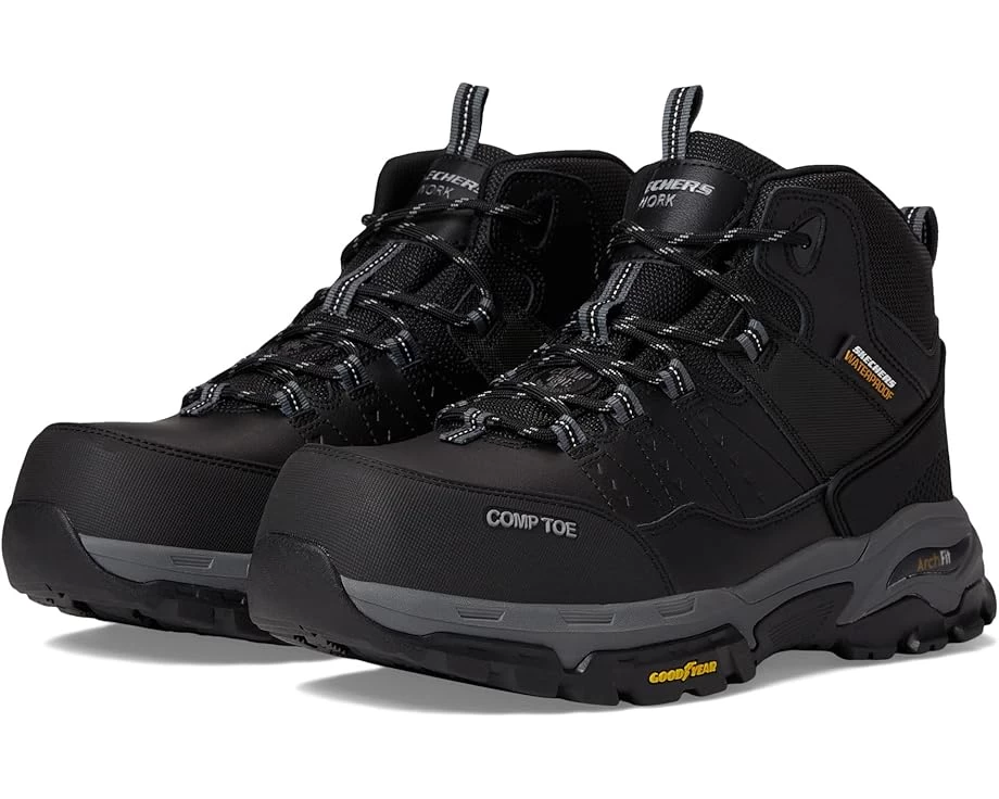 Experience reliable safety and all-day comfort in the SKECHERS® Work Arch Fit Tarver Comp Toe.SKU: #9726026Traditional lace-up closure offers a secure fit.Composite safety toe meets or exceeds ASTM F2413-18 impact and compression, Electrical Hazard (EH) standards.Waterproof design.Removable insole helps mold to your foot to reduce shock and increase weight dispersion.Synthetic coated leather and synthetic upper.Textile lining and insole.Slip-resistant Goodyear® rubber outsole meets ASTM F2913-19 standard, delivers enhanced traction, stability and durability.Imported.Product measurements were taken using size 9, width D – Medium. Please note that measurements may vary by size.Measurements: