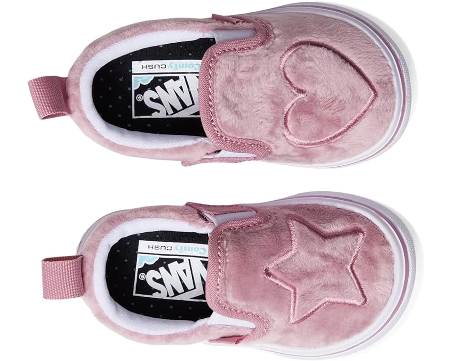 Your little one will enjoy comfort and style in the cute and sparkly Vans® Kids ComfyCush Slip-On V with elastic side accents, hook-and-loop closures, moisture wicking lining, added arch support, and a new soft ComfyCush outsole that feels like walking on a cloud.SKU: #9476255Slip-on style.Low profile silhouette with sturdy canvas uppers.Elastic side accents.Hook-and-loop closures.Moisture-wicking lining. Simplified one-piece interiors with added arch support.New soft ComfyCush outsole that feels like walking on a cloud.Back pull tab for easy entry.Textile upper.Textile lining and insole.Synthetic outsole.Imported.Product measurements were taken using size 5 Toddler, width M. Please note that measurements may vary by size.Weight of footwear is based on a single item, not a pair.Measurements: